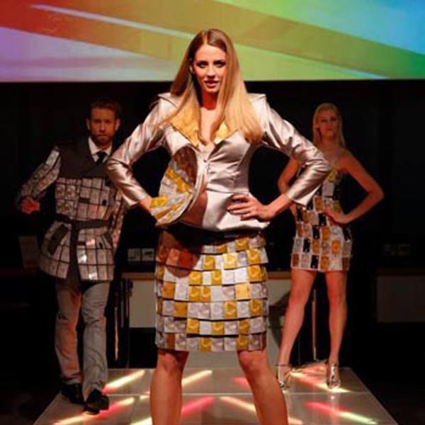 Ein Kleid aus Tapeten, die Corsage aus Metallschanieren, die Schuhe aus TetraPak: