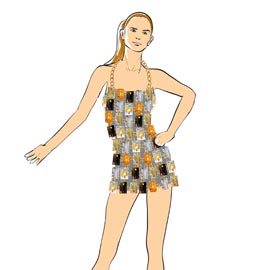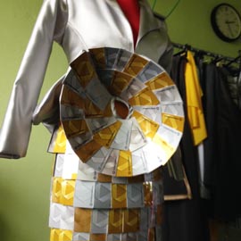 Ein Kleid aus Tapeten, die Corsage aus Metallschanieren, die Schuhe aus TetraPak: